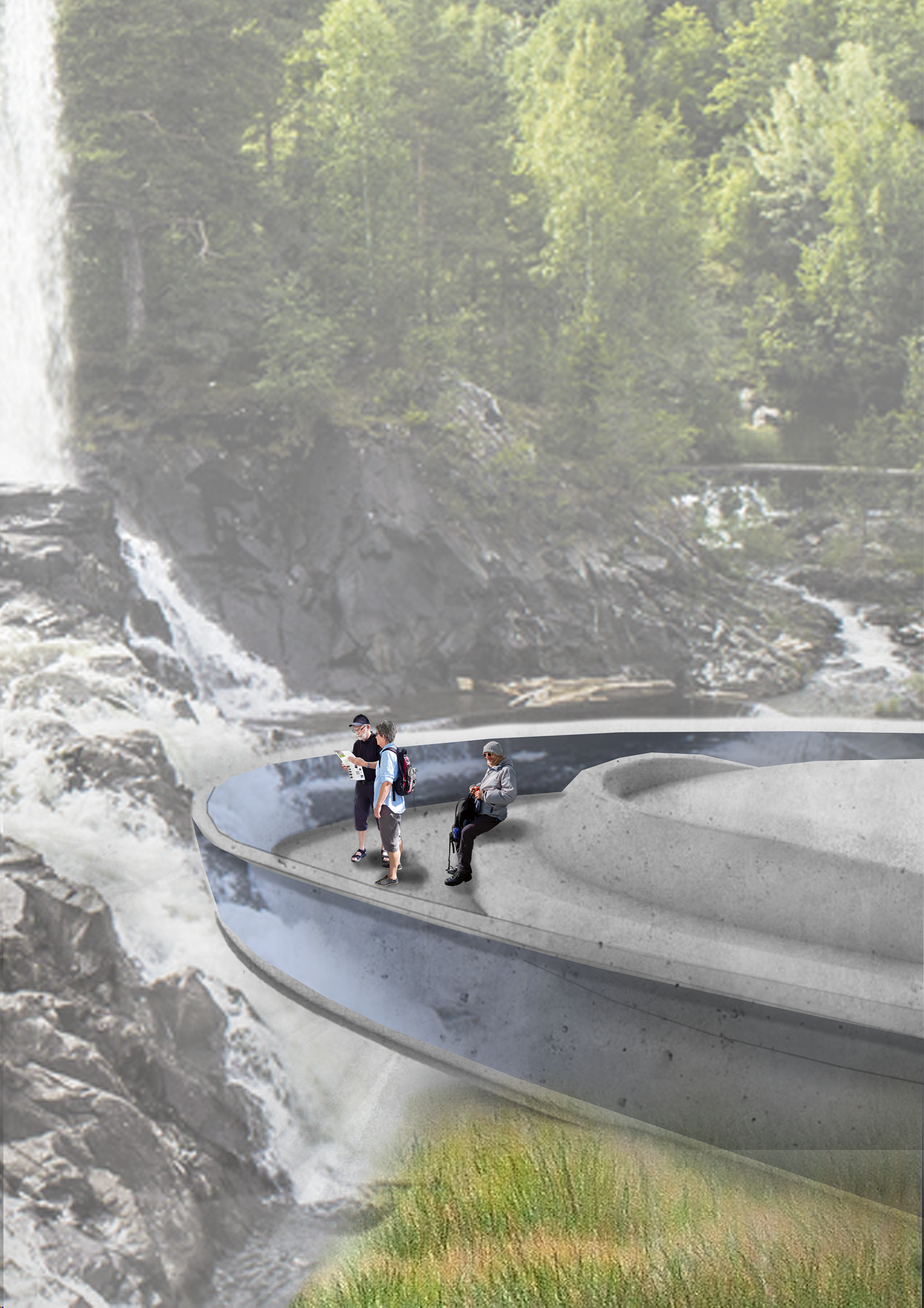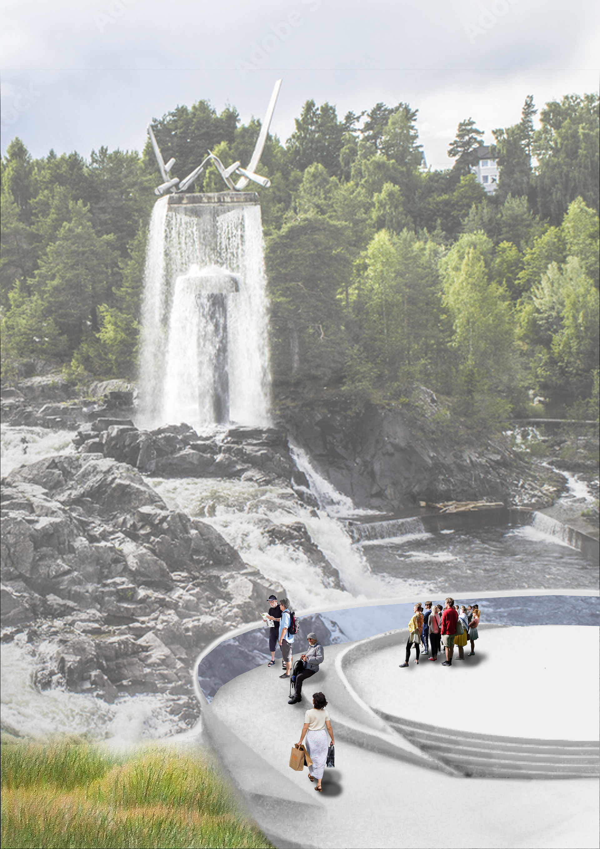 Den naturlige skråningen fra Nordre Park og ned til fossen vil gi optimale muligheter for et naturlig amfi, med tribunemuligheter langs med. To trapper fra parken er foreslått ned til scenen og utsiktspaviljongen, og vil forene parken og fossen bedre på tvers. Installasjonen er plassert slik at fossen og oppgangssaga kommer godt frem, både med og uten brus og brøl. Om fossen blir profesjonelt og teatralsk opplyst (både i forhold til teater og ikke) vil inntrykket virkelig forsterkes. Eventuelt planlagte lysshow vil også kunne bygge opp entusiasmen, og kunne gjennomføres i samtid med eventuelle åpninger av slusene.