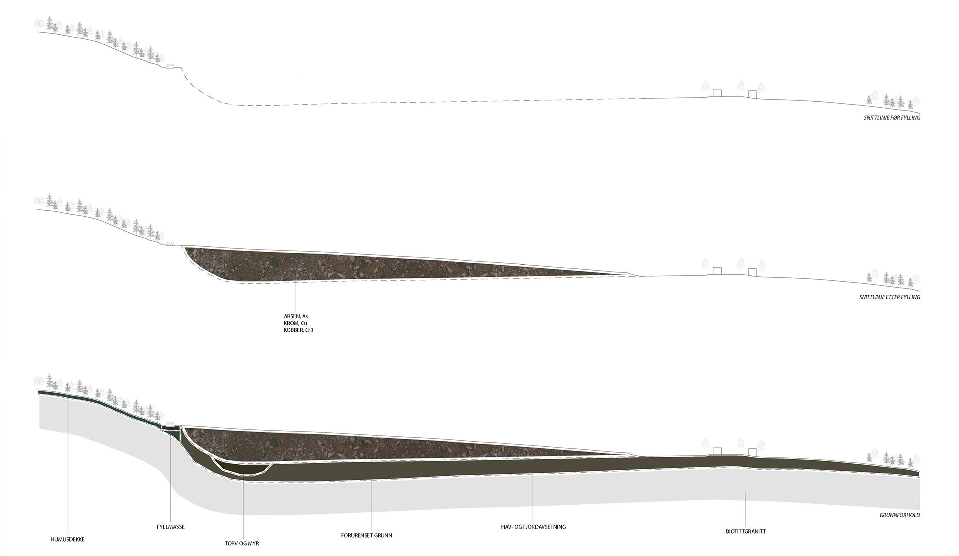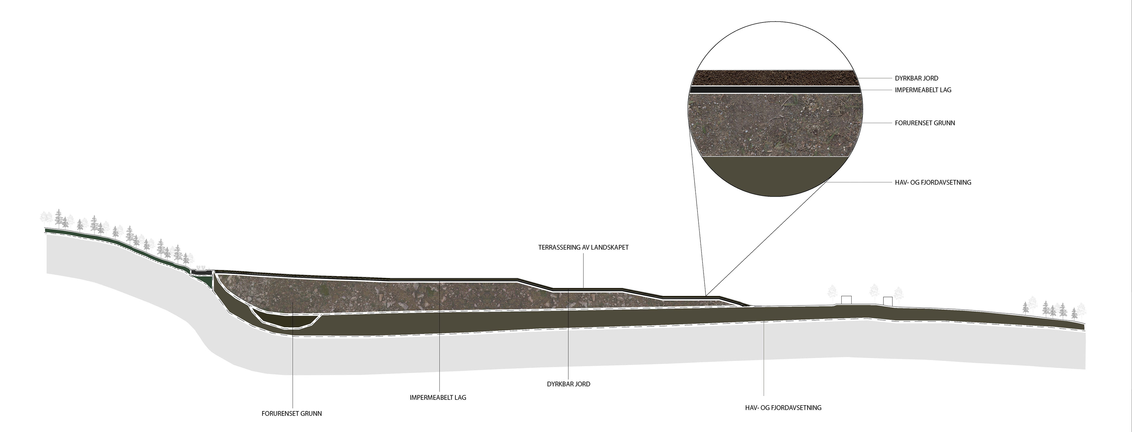 The Skjeggerud plot is a former landfill for soil and clay masses. The area currently has the status of contaminated ground with findings of arsenic, chromium and copper. With climate change, it is in any case necessary that the site is cultivated and secured so that the pollution does not spread. This can be solved by terracing the landscape and by applying an impermeable layer over the filling masses.