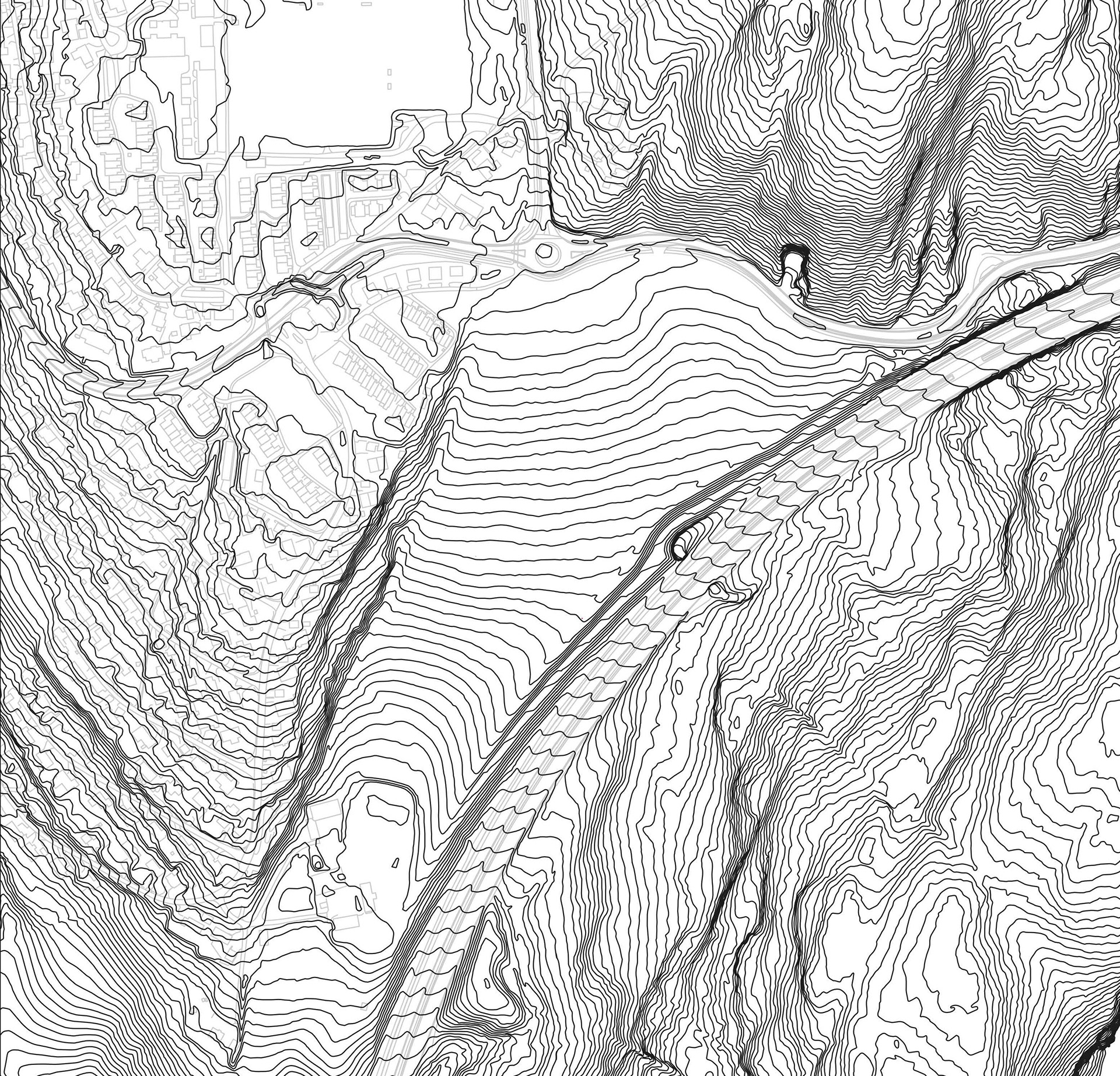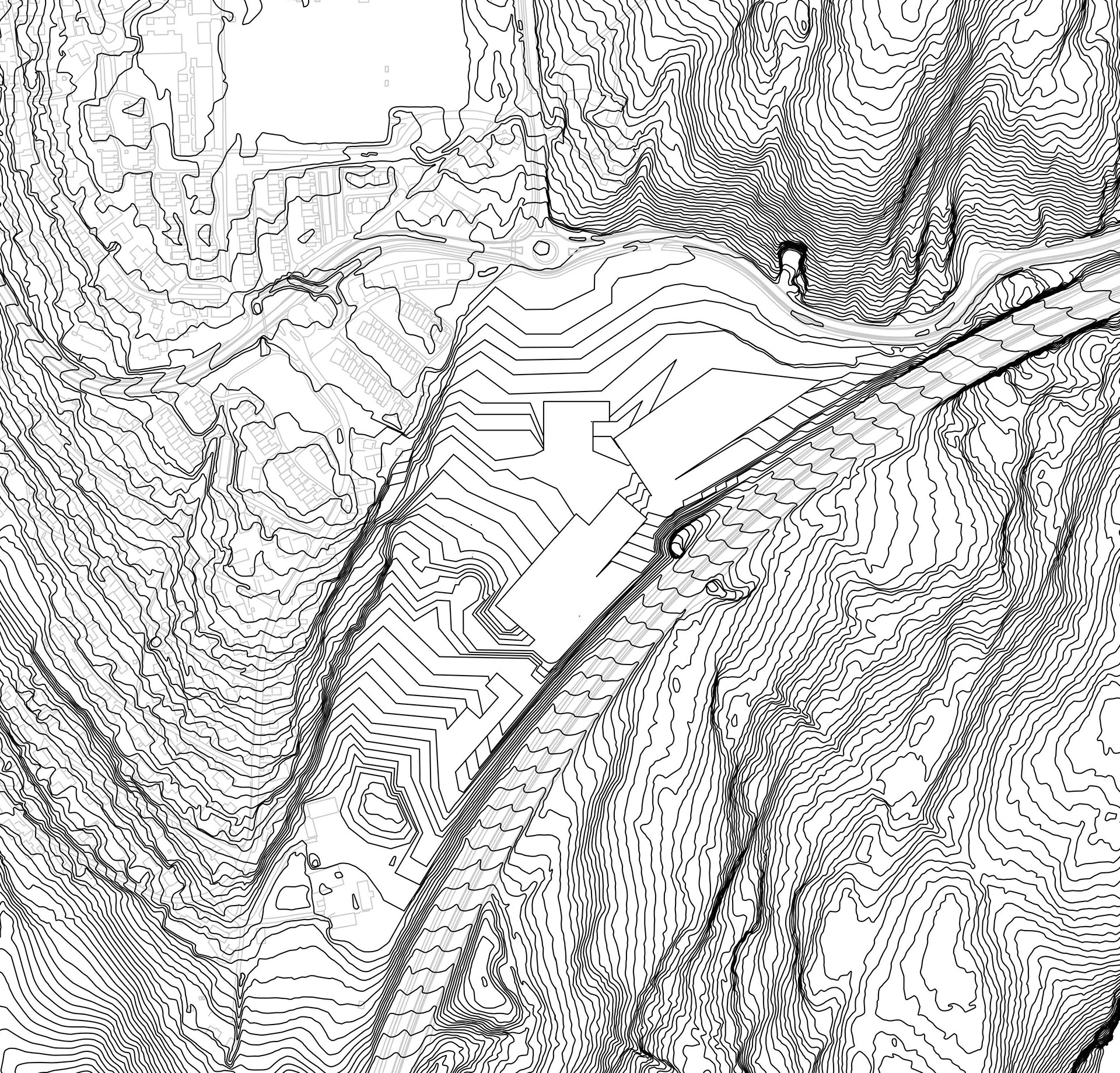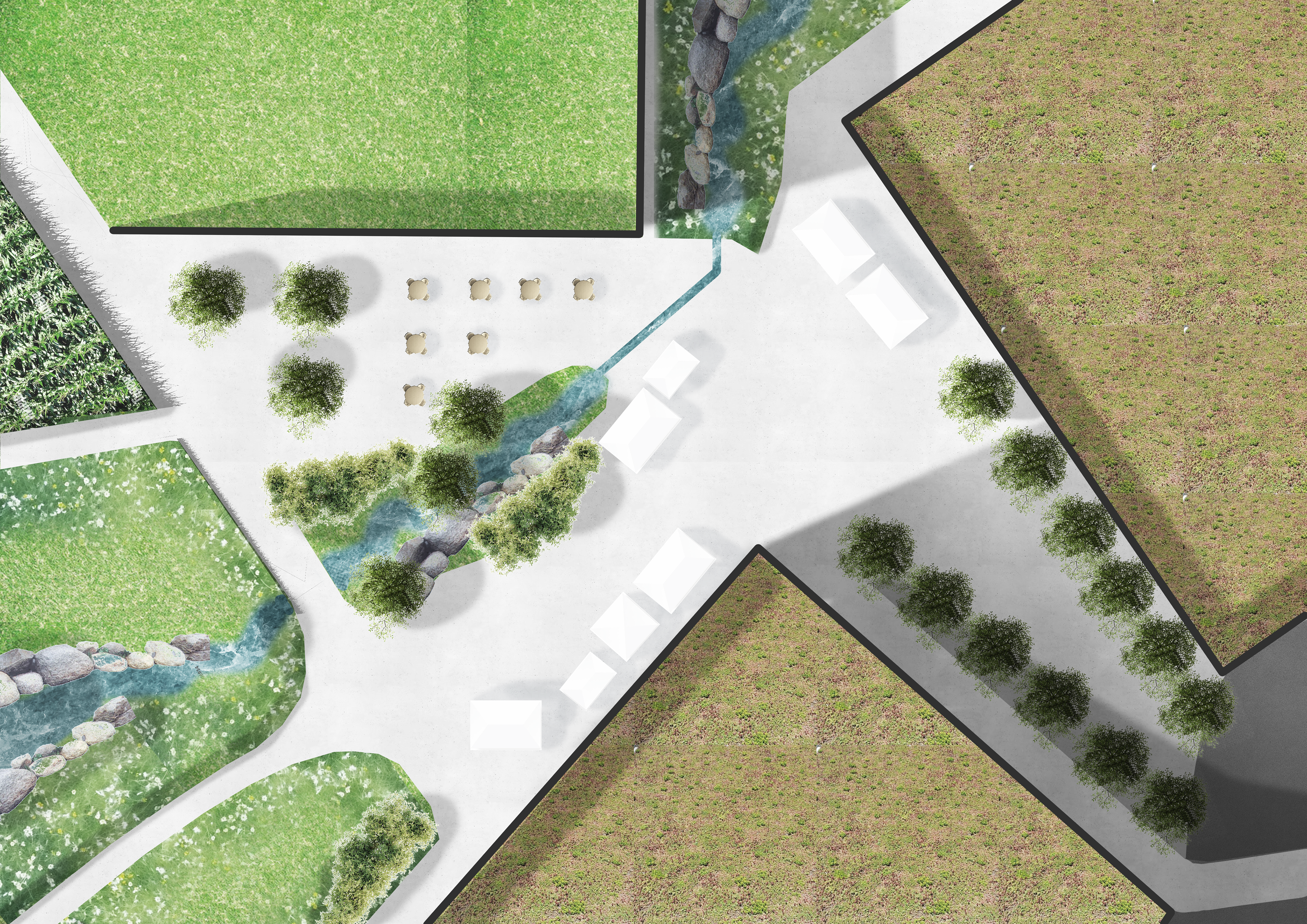 Since the plot is contaminated, the area must be terraced before the rest is designed. The strategy is to carry the surface water with the stream on the left side before it collects in a pond at the bottom.