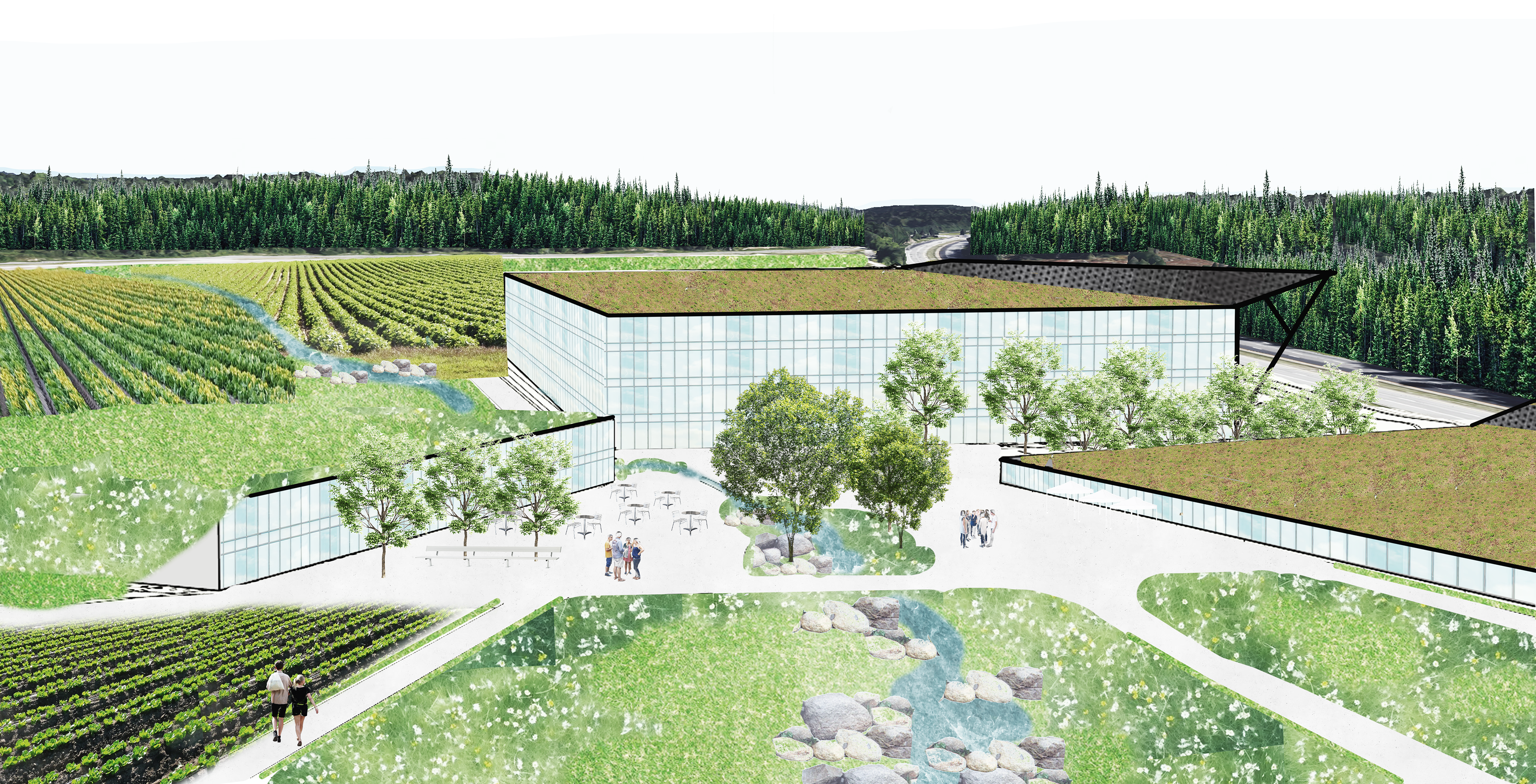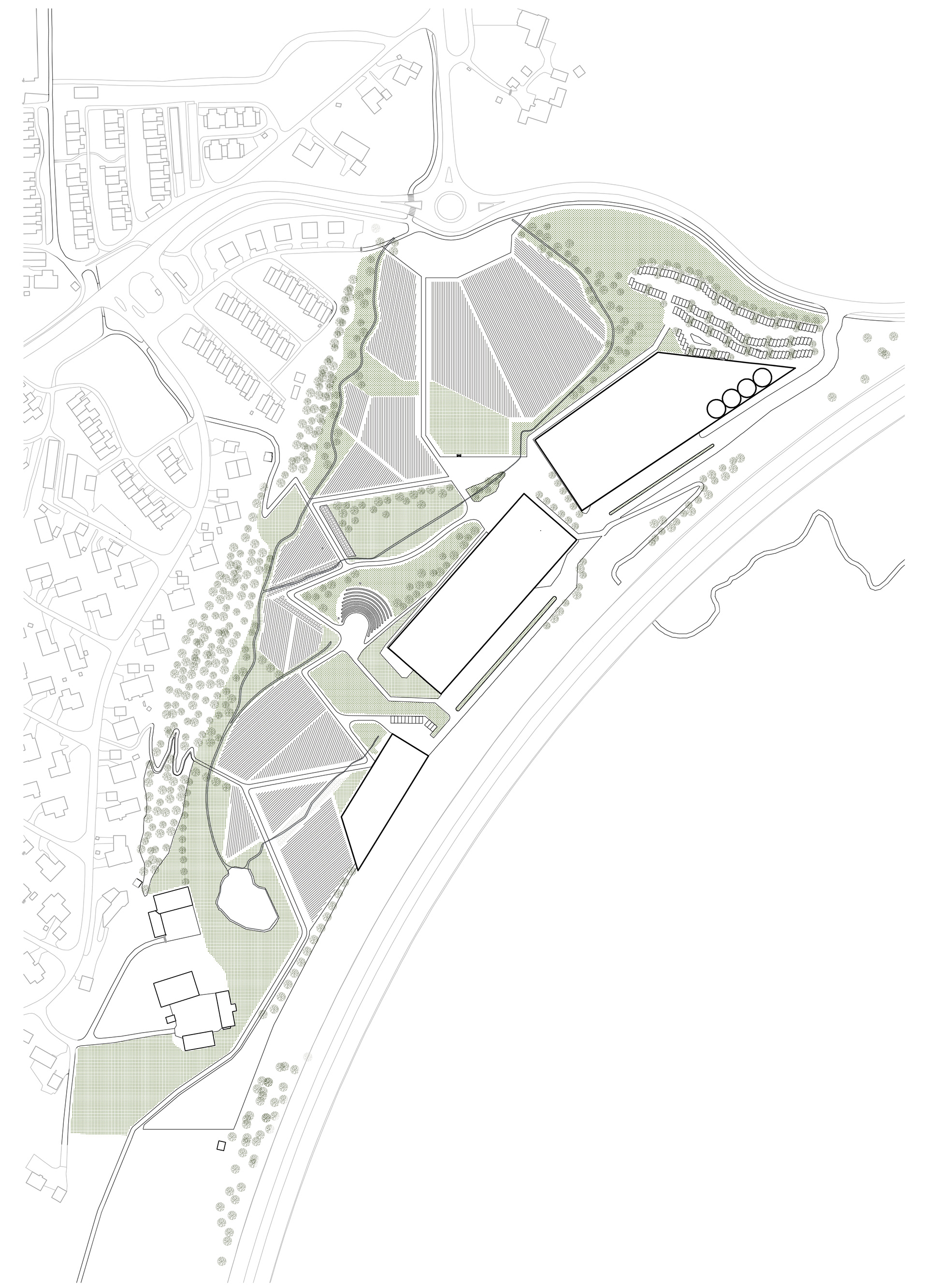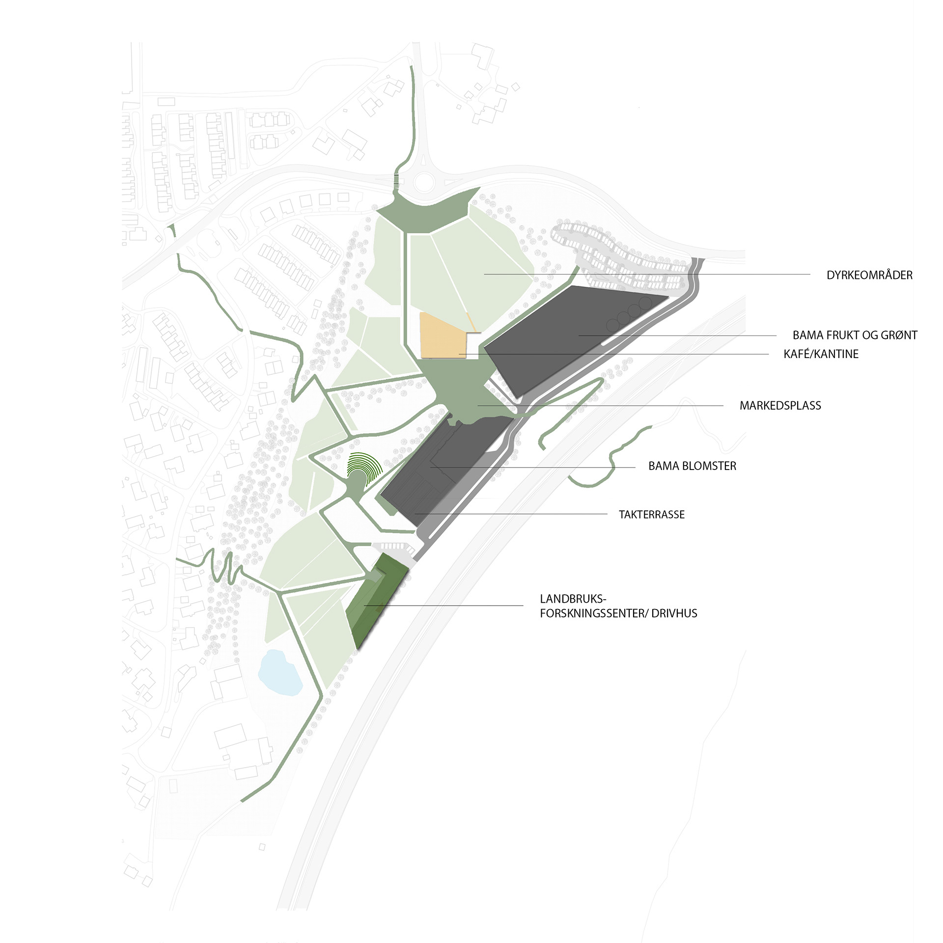 By developing the social impact Bama could have on Tranby`s inhabitants we propose both research centers for food production and social activities such as foodmarkeds and cafees. The most prominant element for the users is the park interweaving the factories with the peri-urban settlements. The park is a network of fields and acers and scenic walks along it. To grasp the typical landscape of Lier the park invites people to use the cultural landscape for recreational walks.
