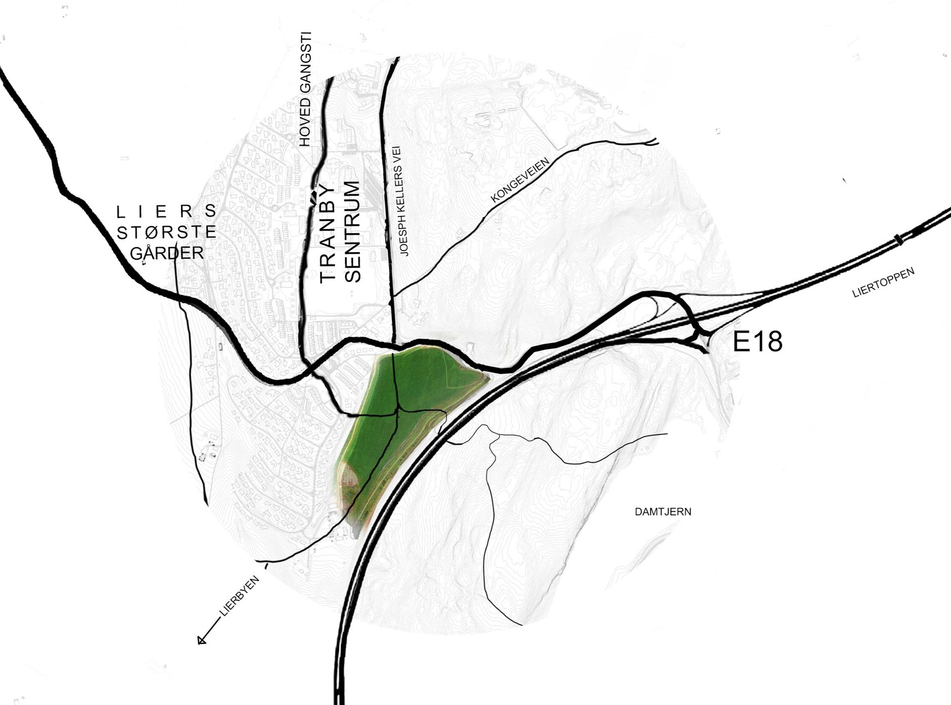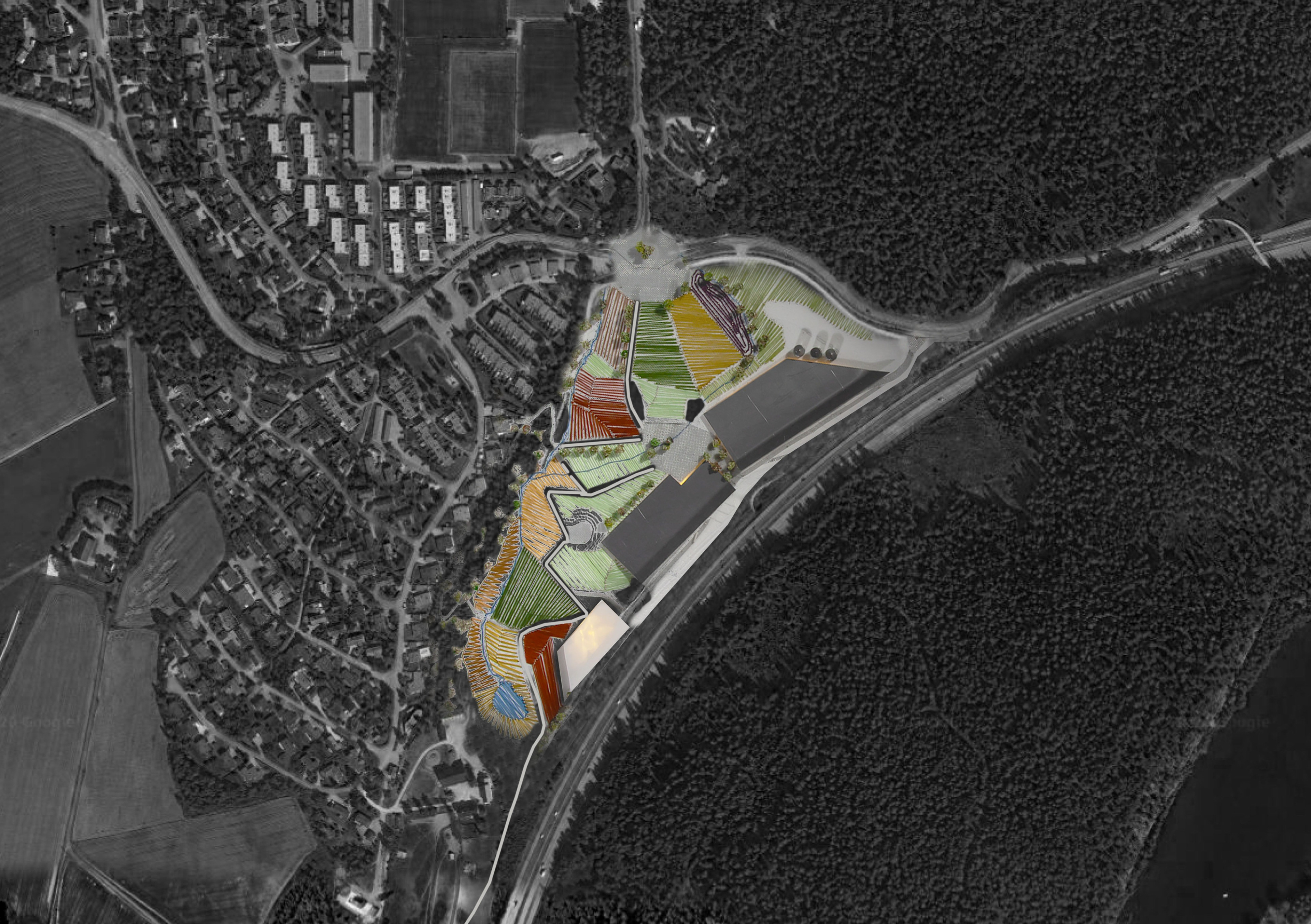 Åkerparken is a project that addresses the urge to look at how corporate investments better can get involved in community methodology. Our initial interest came when looking to the proposed plan for BAMA (vegetable and fruits distributor) inside a recreation forest with historical value. Instead we proposed the Skjeggerud-filling, a field between Tranby village and the highway E18. The site shows signs of contamination so the need for purification is evident, but also the location of the site is logical as it shows relevance to Tranbys urban fabric and the possibility of showcasting towards the highway.